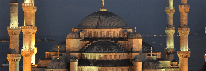 The Blue Mosque or Sultan Ahmet Mosque (Turkish: Sultan Ahmet Camii) is a historic mosque located in Istanbul, Turkey. A popular tourist site, the Sultan Ahmed Mosque continues to function as a mosque today; men still kneel in prayer on the mosque's lush red carpet after the call to prayer. The Blue Mosque, as it is popularly known, was constructed between 1609 and 1616 during the rule of Ahmed I. Its Külliye contains Ahmed's tomb, a madrasah and a hospice. Hand-painted blue tiles adorn the mosque’s interior walls, and at night the mosque is bathed in blue as lights frame the mosque’s five main domes, six minarets and eight secondary domes.[2] It sits next to the Hagia Sophia, another popular tourist site.